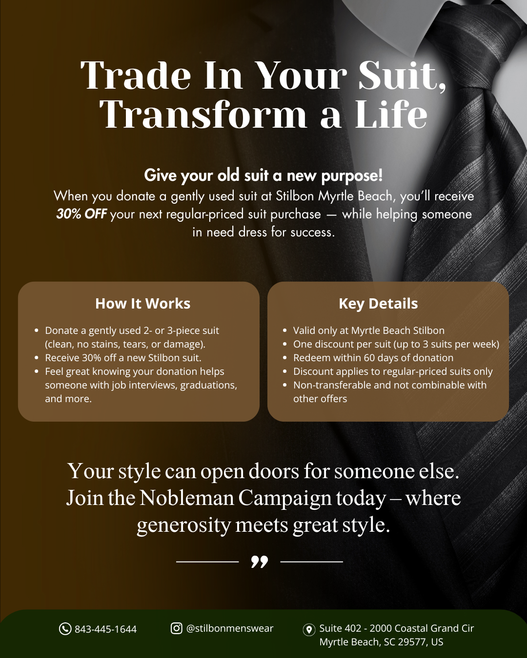 When you donate a gently used suit at Stilbon Myrtle Beach, you’ll receive 30% OFF your next regular-priced suit purchase — while helping someone in need dress for success.